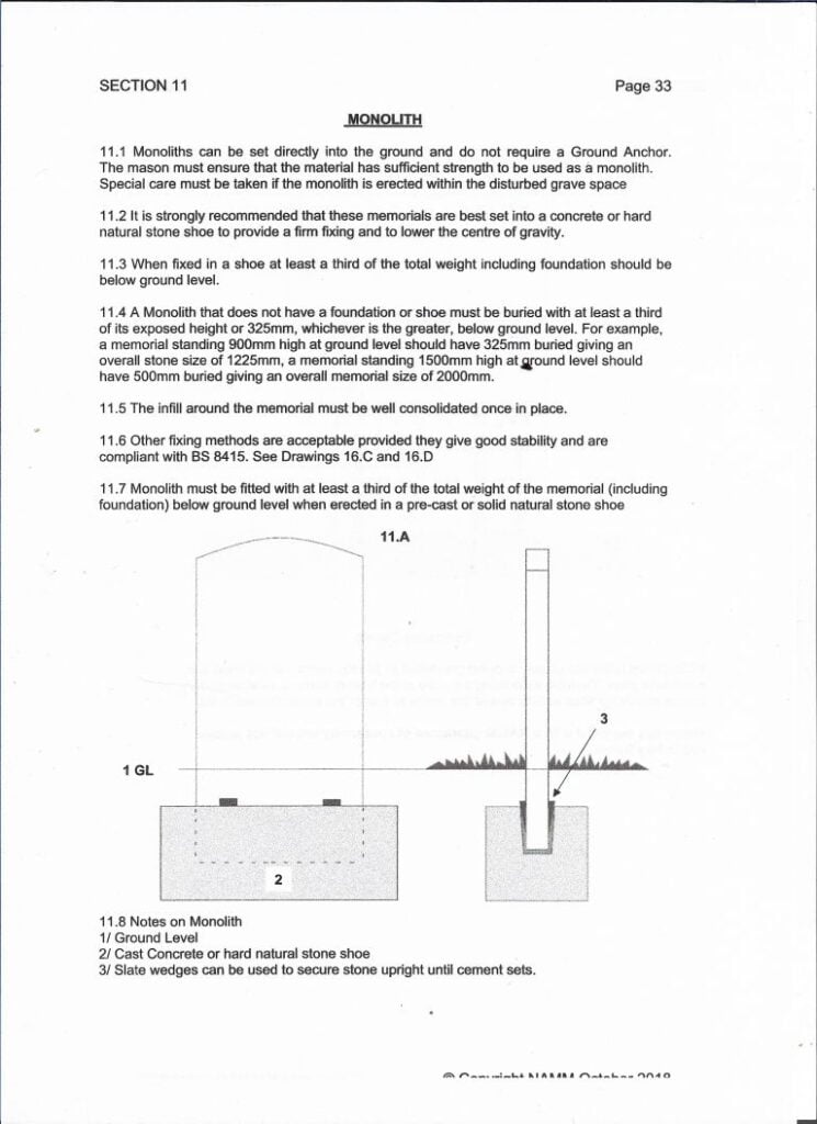 There are two main types of headstone installation methods used by Stone Masons and which are recognised by NAMM (The Assocation of Memorial Masons) under the Health and Saftey regulation BS8415. These are the Monolith Method or the Dowel or Ground Anchor Fixing Method.